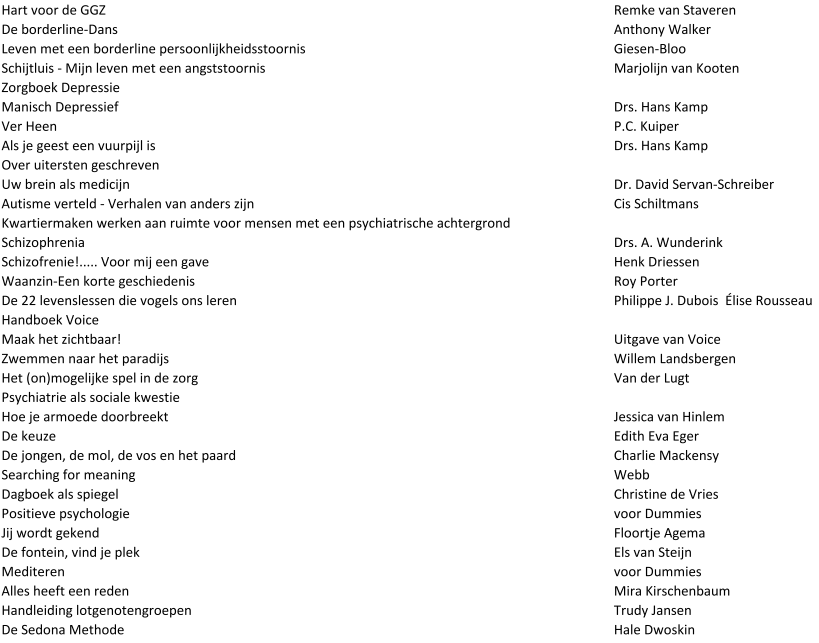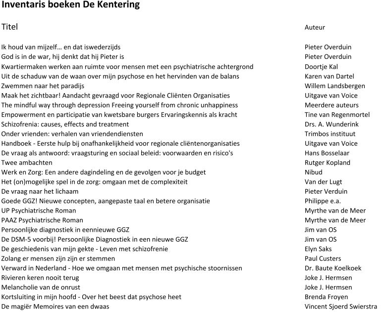 De Kentering heeft een interessante boekenverzameling aangelegd. Er komen steeds meer boeken bij. Deze zijn alle gerelateerd aan de psychiatrie en aanverwante onderwerpen! Kom eens langs bij ons pand aan de Limoslaan 10 in Nijmegen en leen een boek.
