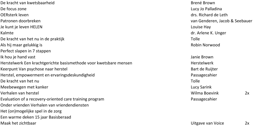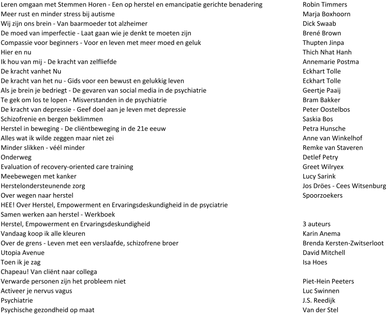 Denk aan herstelverhalen, zelfhulpboeken en informatieve werken.