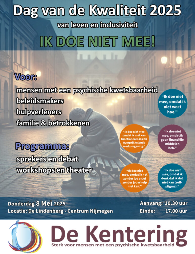 De Kentering organiseert iedere twee jaar een dag om de Kwaliteit van Leven van mensen met een psychische kwetsbaarheid centraal te stellen.